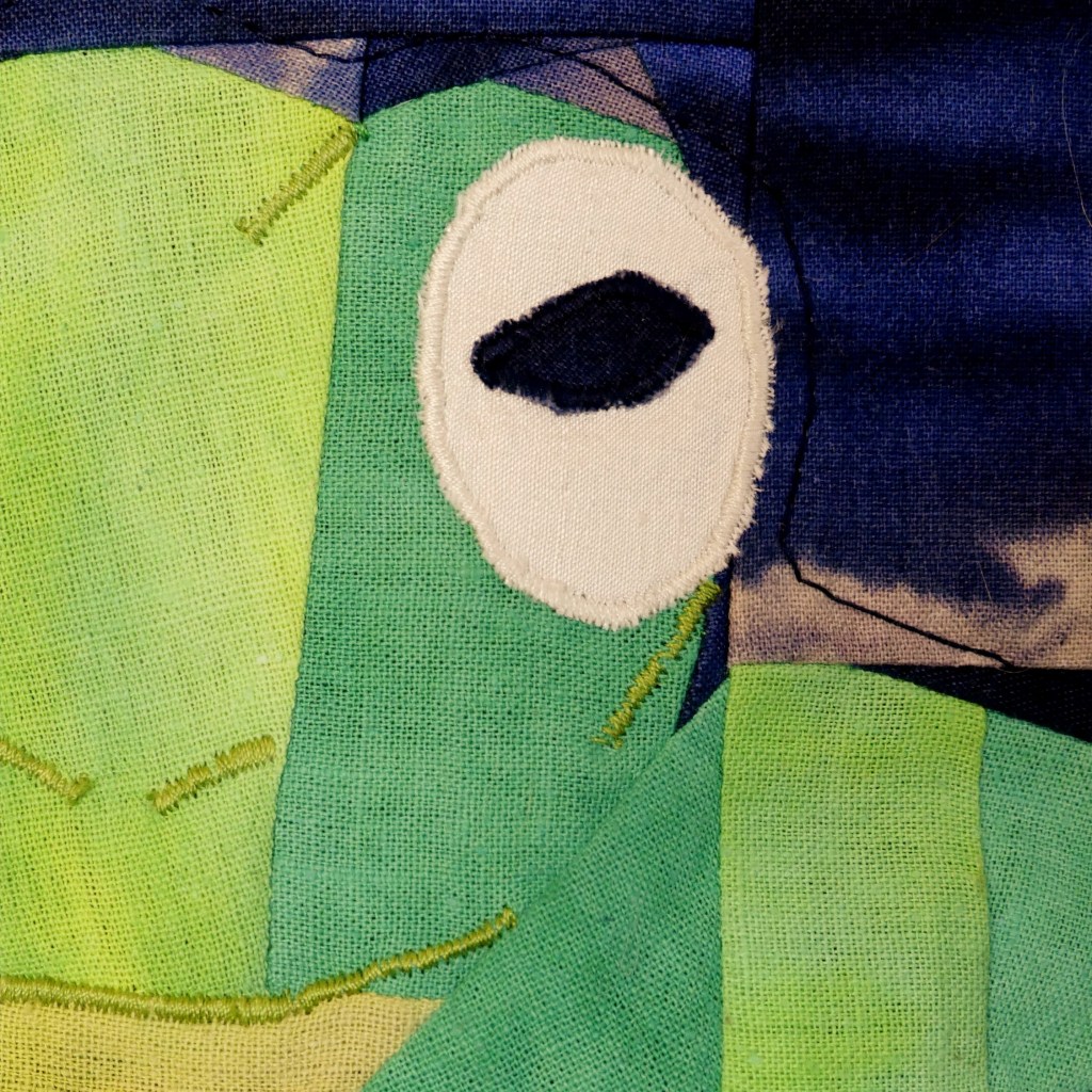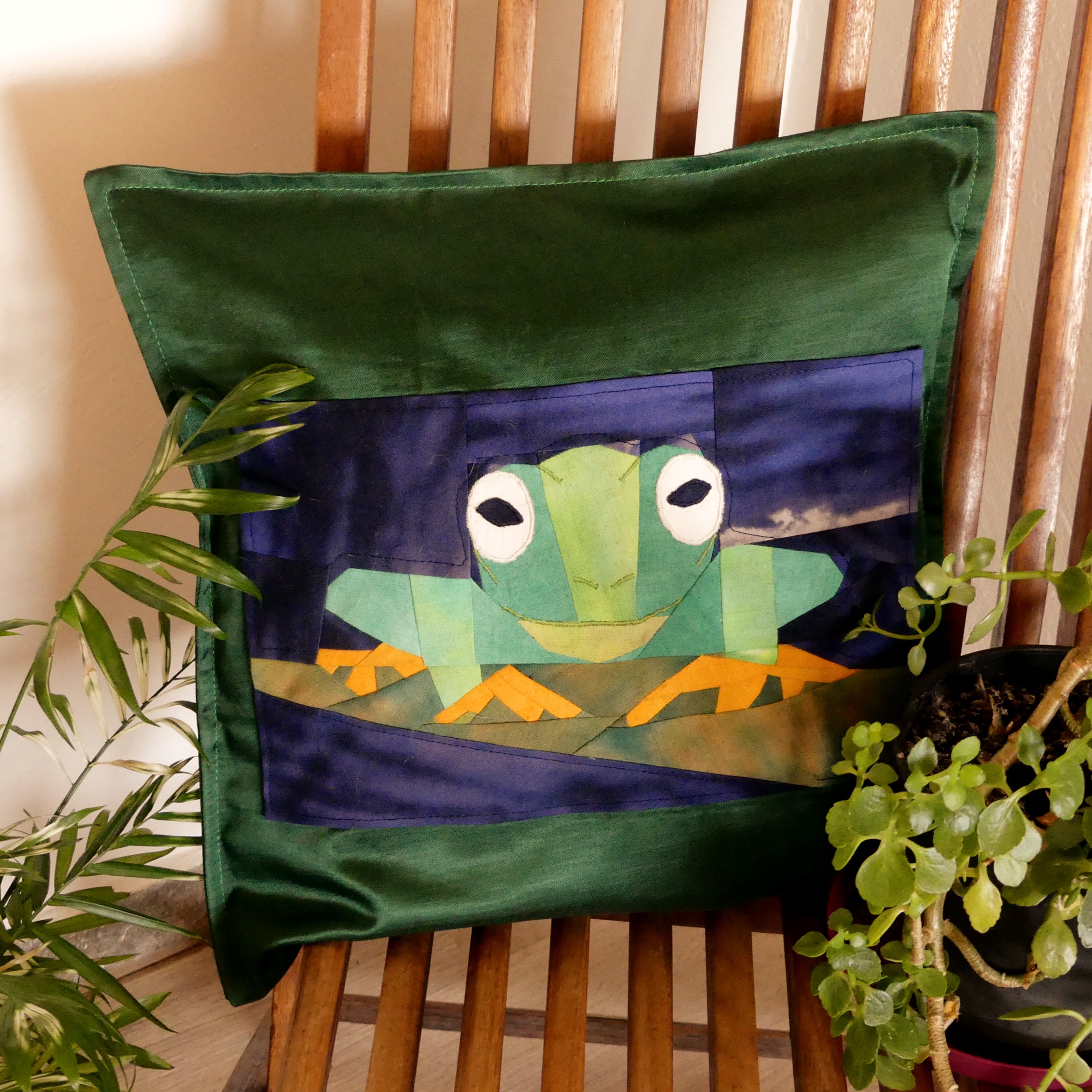 - L’illustration du patchwork animal est composée de tissu en lin, de diverses couleurs pour refléter les nuances d’origine. Seuls les yeux blancs marbrés de bleu de l’atypique grenouille sont composés de soie sauvage. Des broderies en fil de coton respectent fidèlement les lignes de l’animal. Le tissu de la housse verte est en soie de coton.