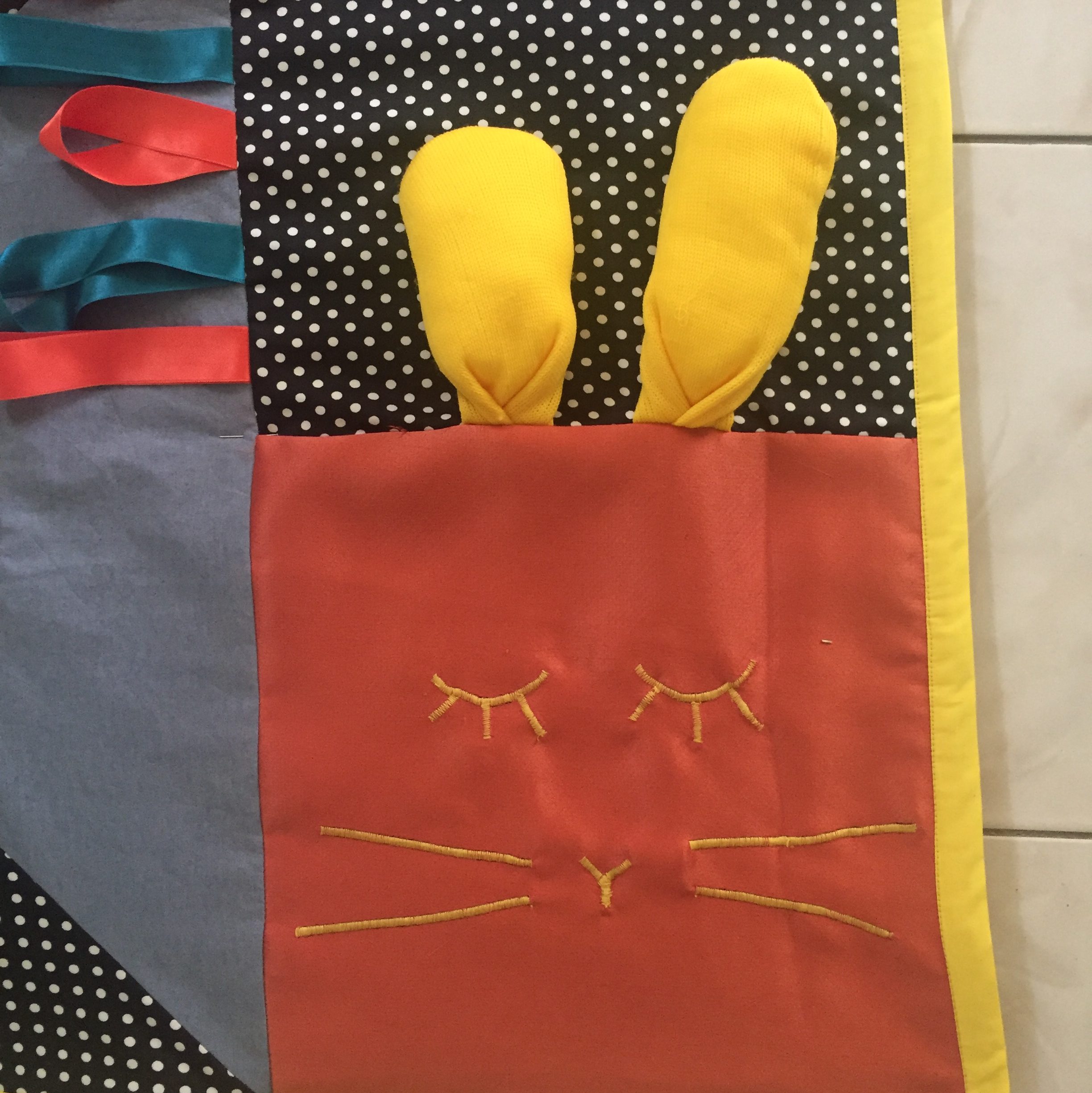 Vous souhaitez un tapis d’éveil personnalisé de votre bambin, contactez moi pour définir les finitions de votre pièce unique (tissu, taille, accessoires de jeu, broderie).