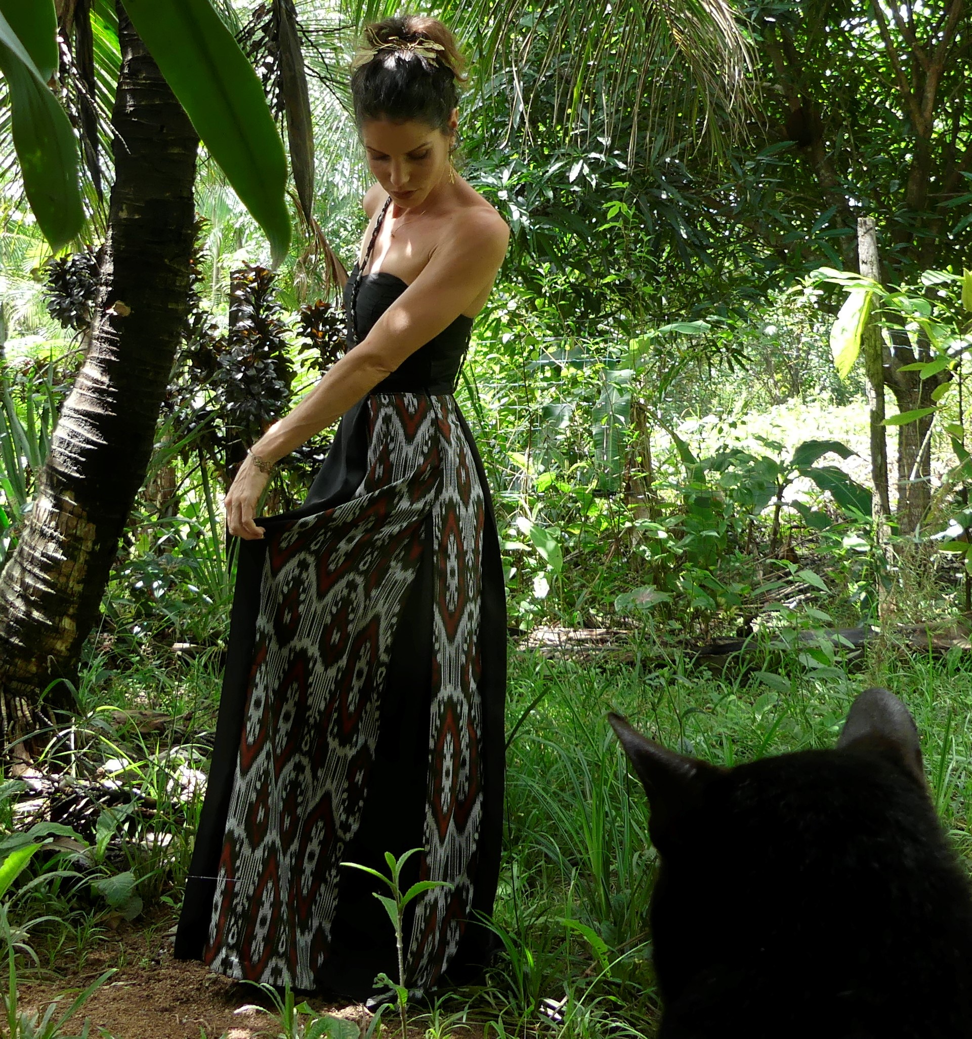 - En contraste, la robe se fini par un long drapé léger. De sublime plis intérieurs et extérieurs jouent avec la combinaison du tissu noir et d’un imprimé tribal déniché en Malaisie (dans la ville de Kutchin plus précisément!).