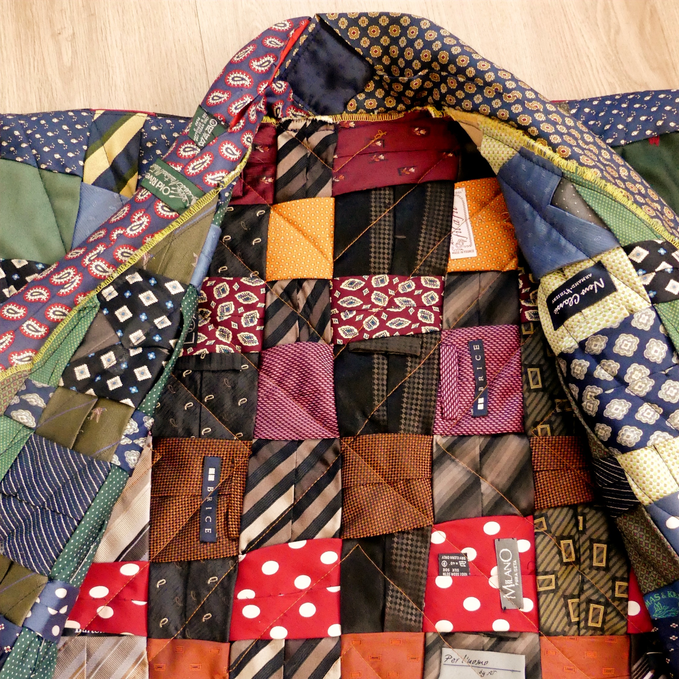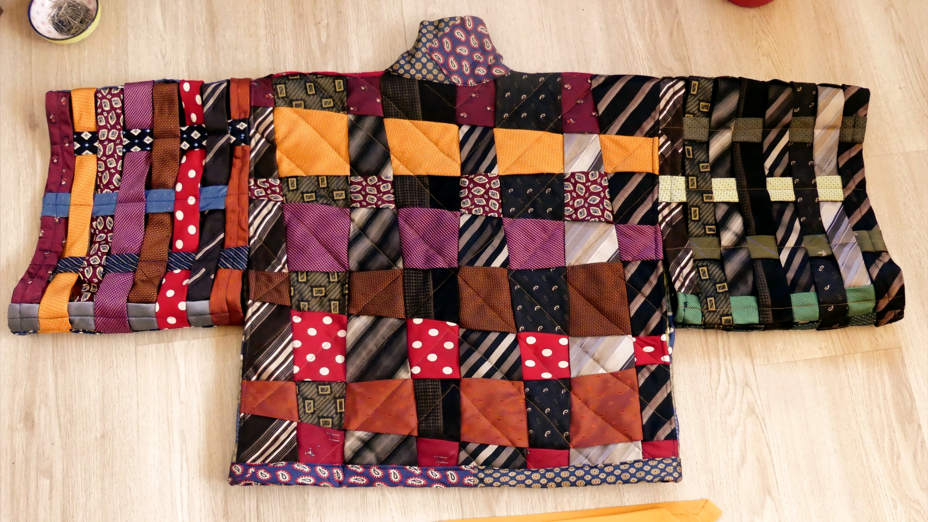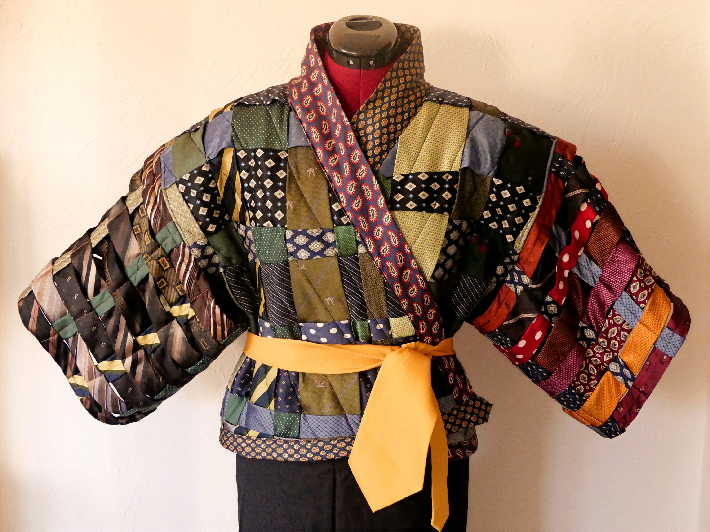 - Pas moins de 40 cravates en soie – soit 1,5kg!- sont combinées jusqu’à trouver une parfaite harmonie de couleur et de ce fait, personne ne pourra jamais avoir le même ! Elles sont ensuite « quiltées », c’est-à-dire surpiquées de couture pour former un design en croix qui attire encore davantage l’œil sur la parure. La confection minutieuse et de qualité de ce Kimono en soie ne peut se faire que de manière artisanale.