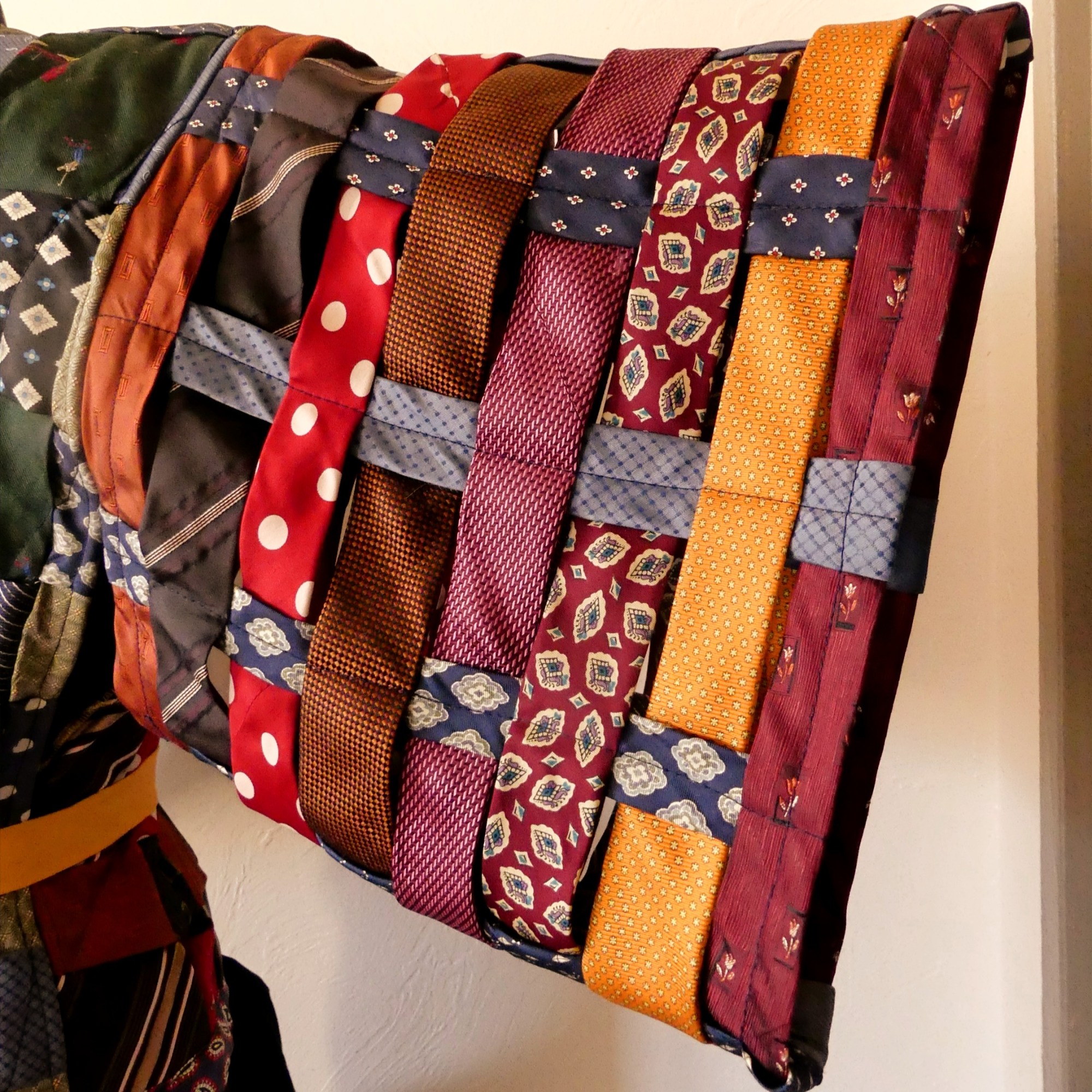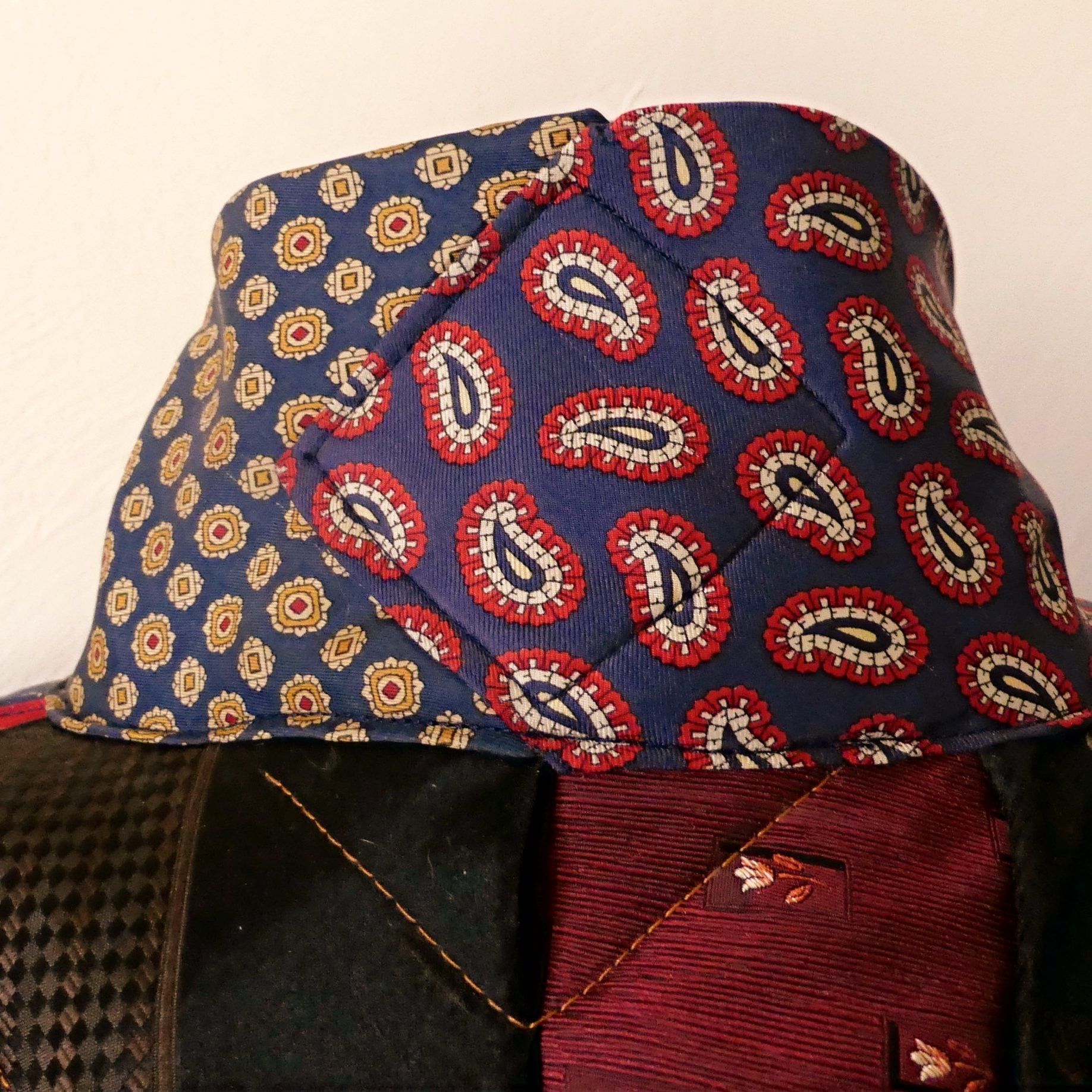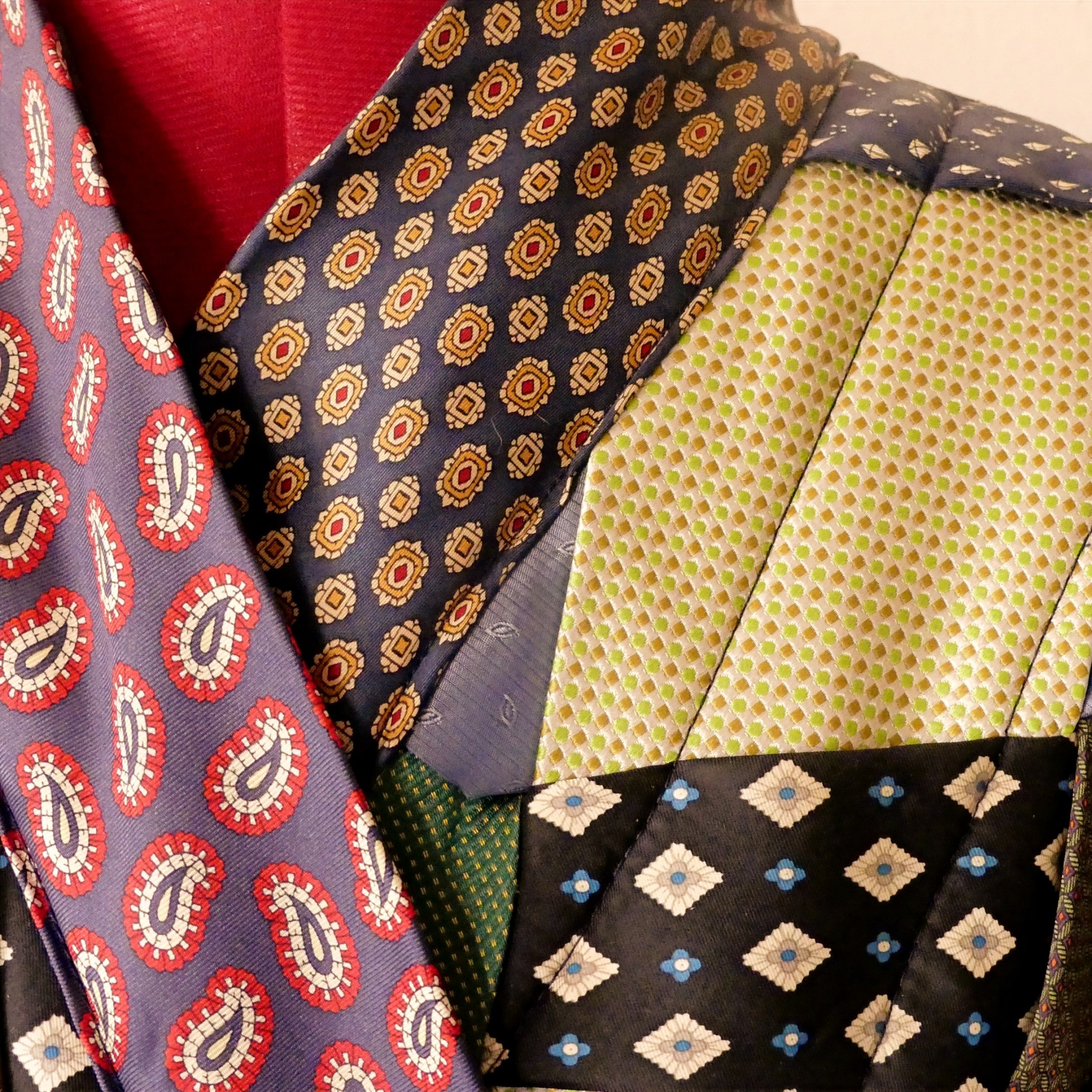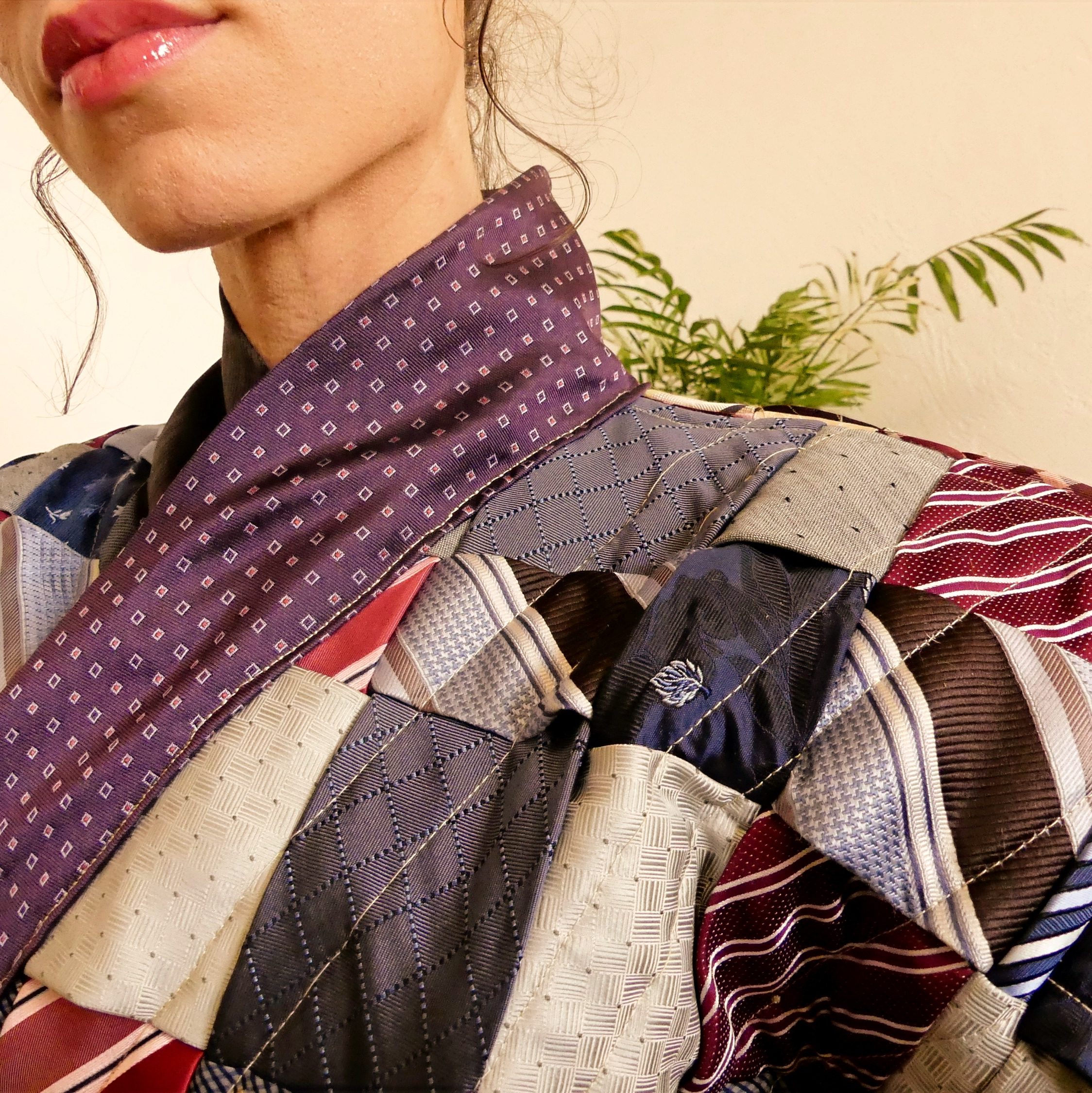 - Pas moins de 40 cravates en soie – soit 1,5kg!- sont combinées jusqu’à trouver une parfaite harmonie de couleur et de ce fait, personne ne pourra jamais avoir le même ! Elles sont ensuite « quiltées », c’est-à-dire surpiquées de couture pour former un design en croix qui attire encore davantage l’œil sur la parure. La confection minutieuse et de qualité de ce Kimono en soie ne peut se faire que de manière artisanale.