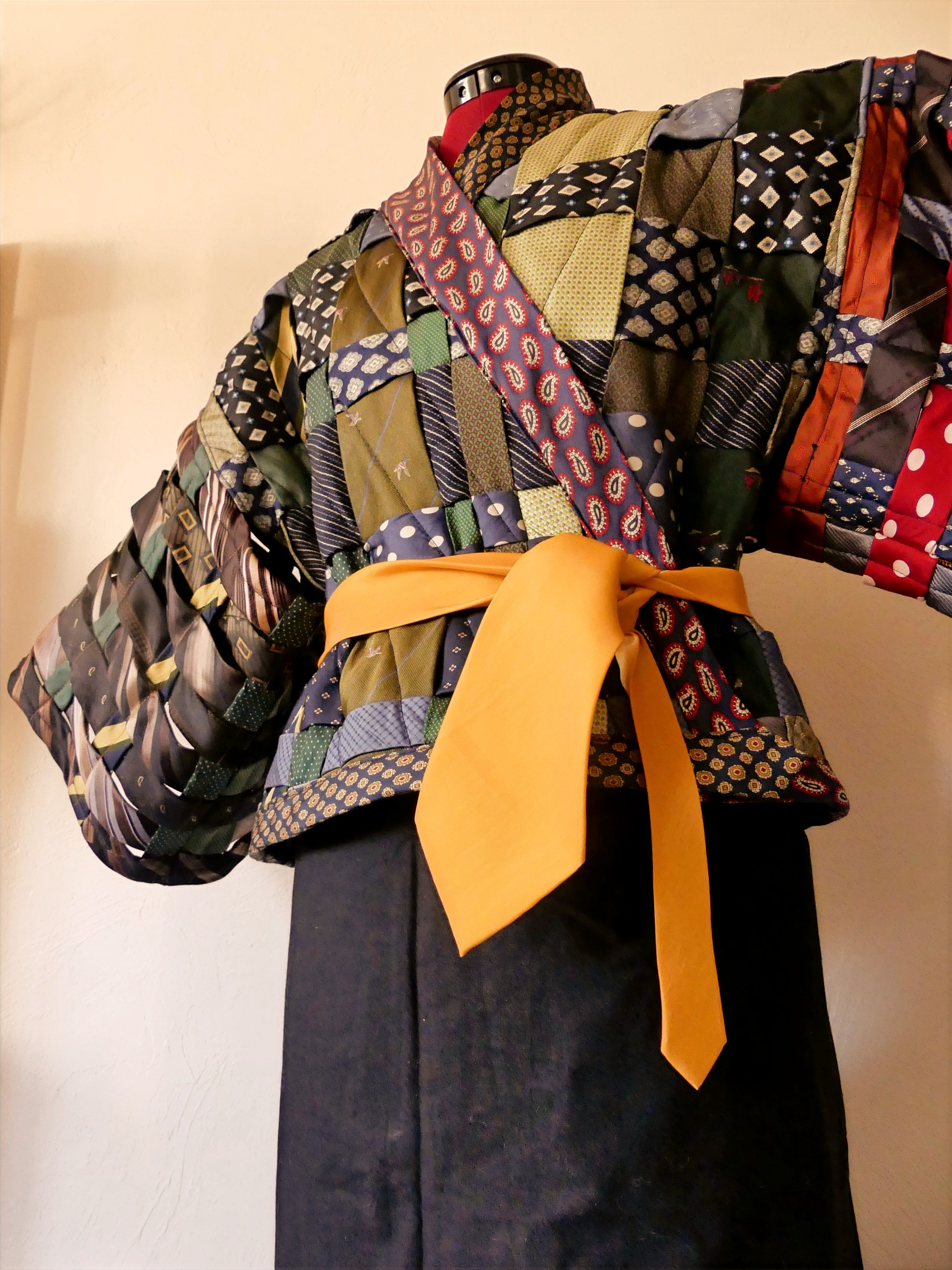 Le modèle porté est un Kimono formé d’une autre combinaison de cravates.