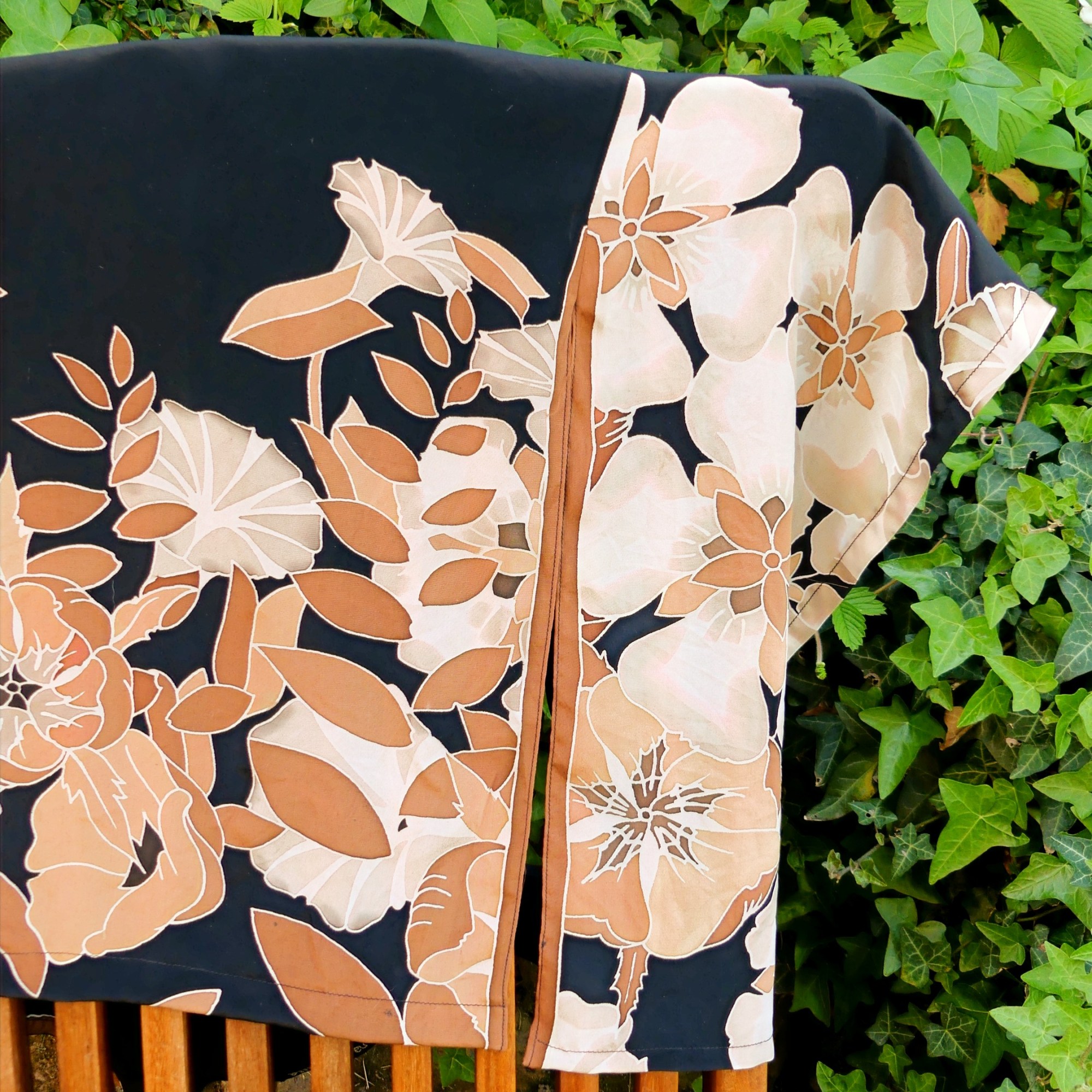 - Le drapé de ce gilet en soie bohème chic est entièrement peint à la main par un atelier, sublimé par une touche très féminine au motif floral en mode Art Déco. Les couleurs, valorisées par la matière noble de la fibre de soie, sont fabuleusement lumineuses avec des tons métalliques.