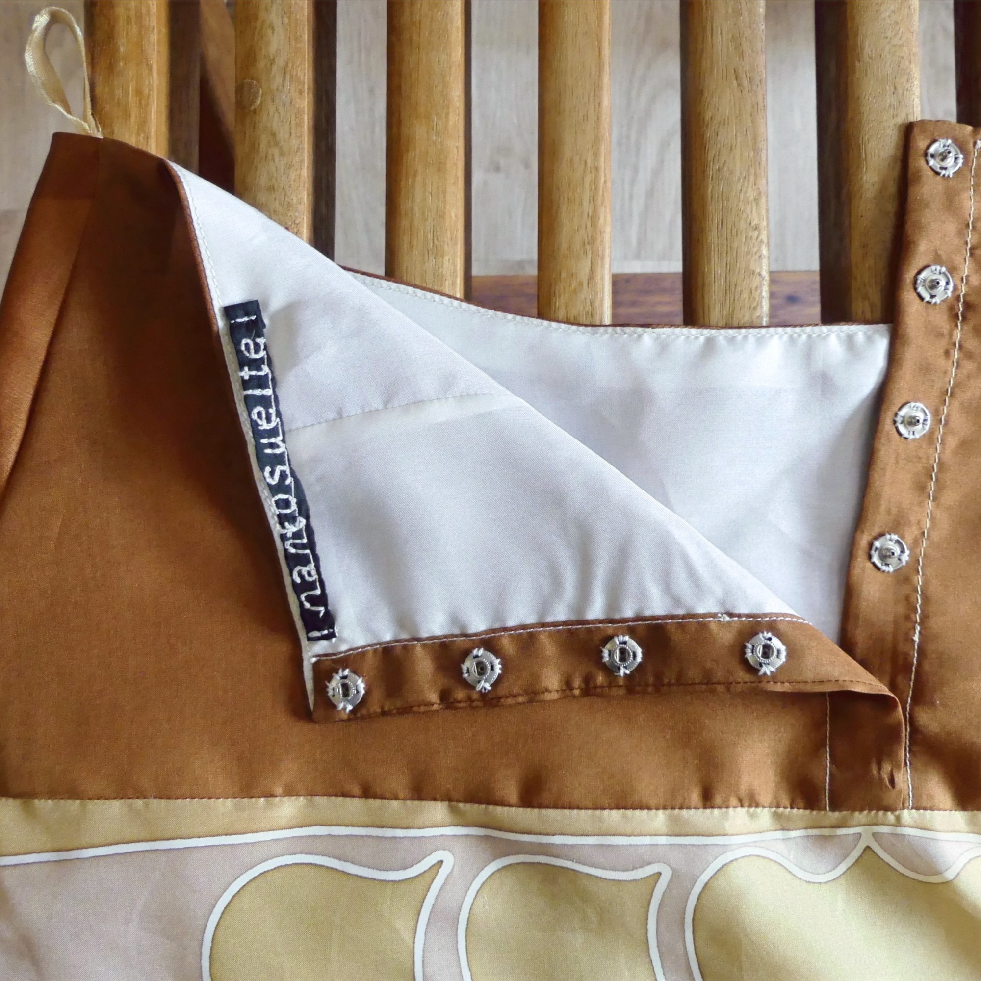 - Les finitions hautes coutures avec des parmentures et des coutures anglaises permettent un rendu luxueux, tant à l’extérieur qu’à l’intérieur du vêtement. La jupe se ferme en toute discrétion par des boutons intérieurs upcyclés.