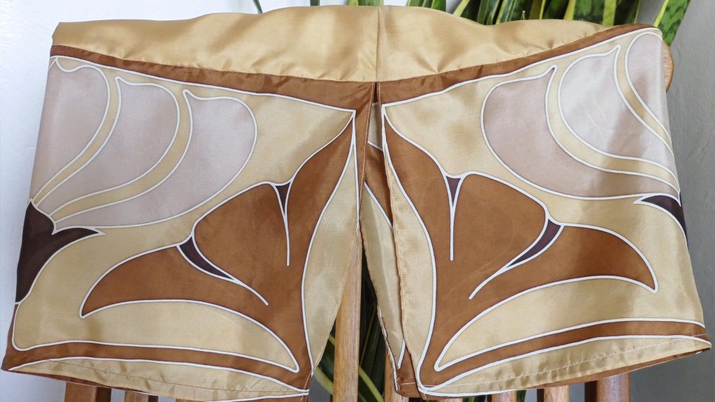 - Le drapé de cette jupe en soie habillée est entièrement peint à la main par un atelier. Les couleurs, valorisées par la fibre noble de soie, sont fabuleusement lumineuses avec des tons cuivrés.